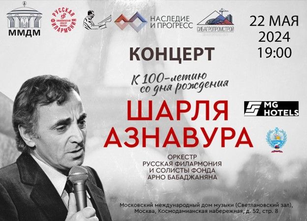 В Московском международном Доме музыки прошёл юбилейный концерт в честь 100-летия Шарля Азнавура. 22 мая, в день рождения всемирно известного шансонье Шарля Азнавура в Московском международном Доме музыки состоялся юбилейный концерт. Мероприятие открыл своим приветственным выступлением Президент Фонда «Наследие и Прогресс», академик РАН Армаис Камалов: «Красота и сила музыки заключается в том, что это единственный язык в мире, который не требует перевода, тем самым объединяя все народы мира и страны вокруг этого творчества, собственно таким талантом и силой обладал блестящий певец, композитор и поэт — Шарль Азнавур.